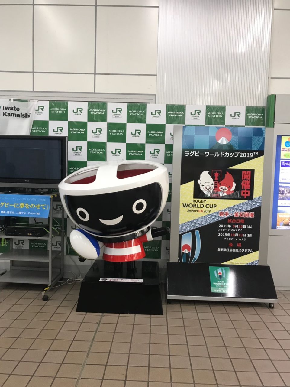 盛岡駅に到着!そばっち(ラグビーバージョン)のお出迎えです!